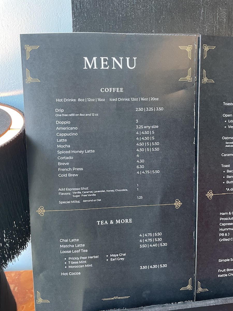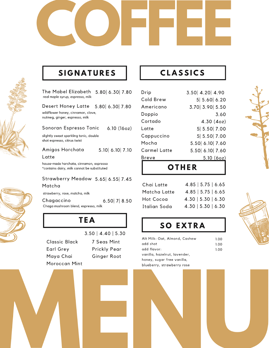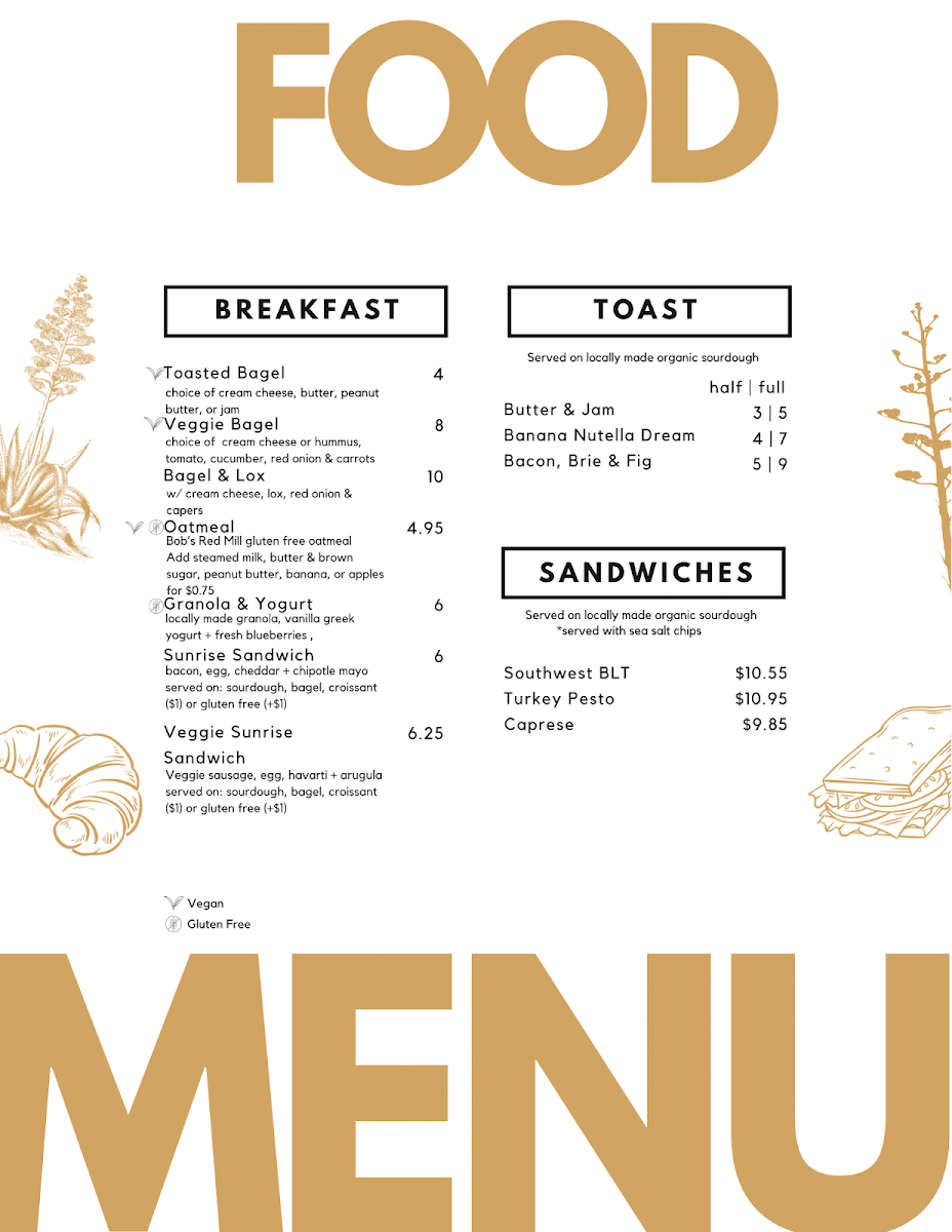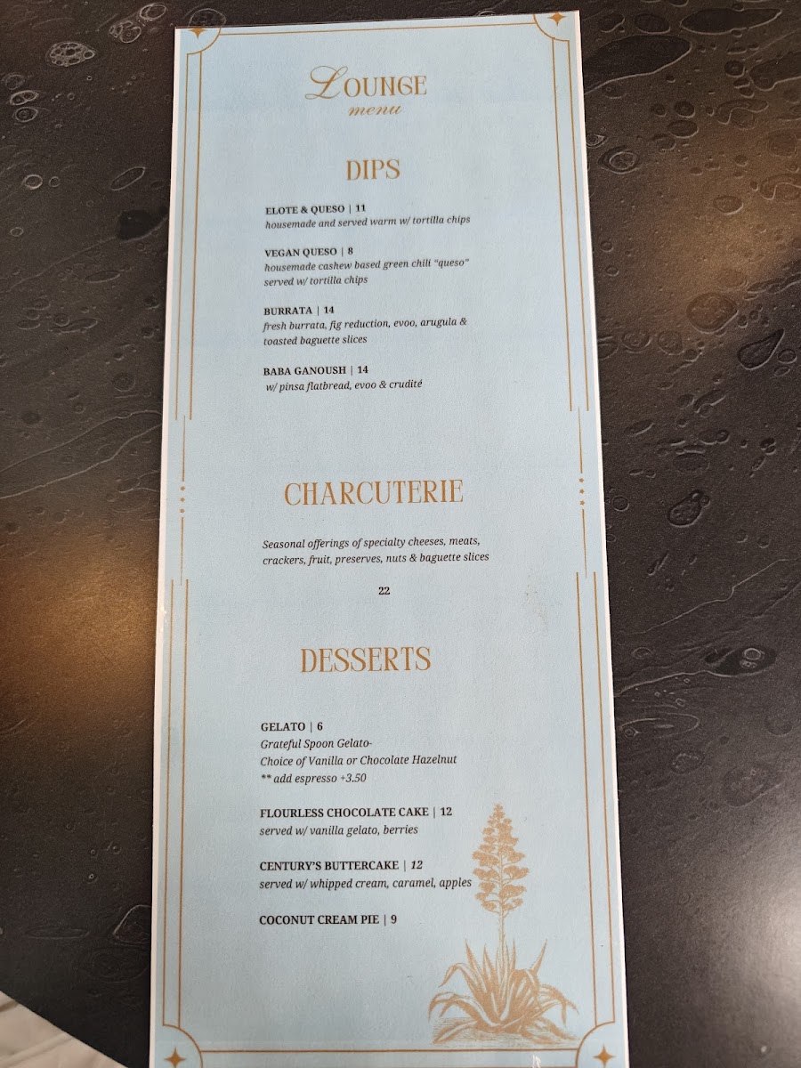 The menu at The Century Lounge offers a delightful range of options, combining classic favorites with unique twists. For coffee lovers, the "Coffee - Classics" section features beverages like Cappuccino, Americano, and Caramel Latte, each a warm, comforting choice. The Coffee - Signatures section introduces more creative options, including the Amigos Horchata Latte, Chagaccino, and Sonoran Espresso Tonic (16oz). For a refreshing change, there’s also the seasonal Pandan Matcha and Pumpkin Spice Latte. If you're in the mood for something light, the Small Bites menu includes Mashed Potato Tots, Charcuterie, and a delicious Berry Brie Croissant. Breakfast fans will love options like Super Avocado Toast, Toasted Bagel, and the Sunrise Breakfast Sandwich. For those craving something savory, the Handheld section presents tempting choices such as the Grilled Goat, Turkey Club, and BLTA. The Soup & Greens offerings include a refreshing House Salad, perfect for pairing with any of the other dishes. And for those who want something to sip along with their meal, there are also bottled drinks like Mountain Valley Spring Water and Diet Coke Can 12oz. Whether you're stopping by for a quick bite or a relaxing coffee experience, The Century Lounge offers a menu that caters to a variety of tastes and cravings.